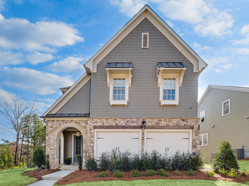 The Benton at gated Lakeside at River Green by John Wieland/JW Collection offers 3,488 sq. ft. of beautifully designed living space across three levels with an included elevator for effortless access. The second-level primary suite features a spa-inspired bath with a zero-entry shower, while the expansive finished terrace level provides additional living space. Dual rear decks overlook peaceful nature views, and thoughtful 55+ features throughout the home support comfortable, easy living.